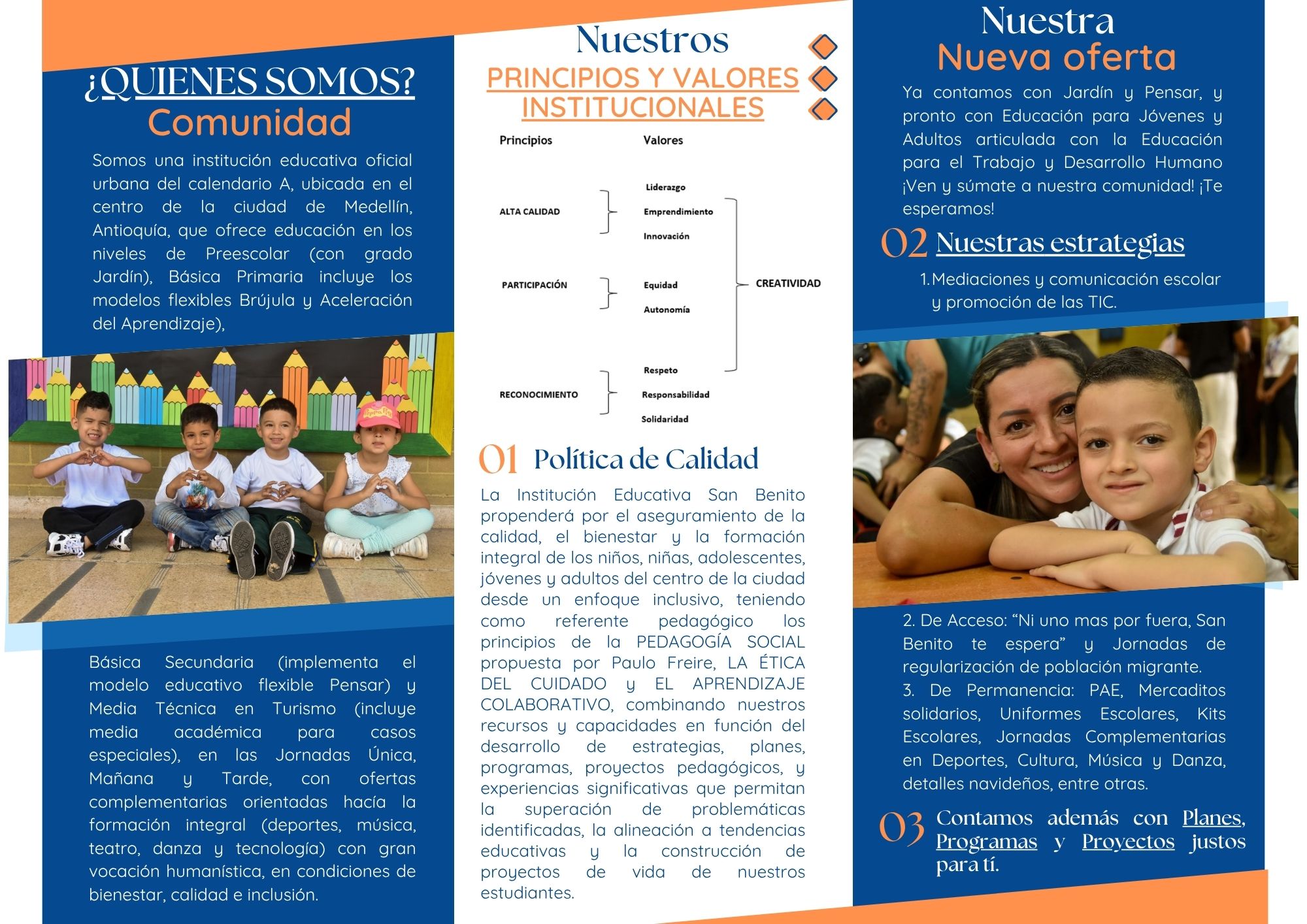 Somos una institución educativa oficial urbana del calendario A, ubicada en el centro de la ciudad de Medellín, Antioquía, que ofrece educación en los niveles de Preescolar (con grado Jardín), Básica Primaria (incluye los modelos flexibles Brújula y Aceleración del Aprendizaje), Básica Secundaria (implementa el modelo educativo flexible Pensar) y Media Técnica en Turismo (incluye media académica para casos especiales), en las Jornadas Única, Mañana y Tarde, con ofertas complementarias orientadas hacía la formación integral (deportes, música, teatro, danza y tecnología), con gran vocación humanística, en la cual procuramos a todos los integrantes de la comunidad educativa las mejores condiciones de bienestar, calidad e inclusión. Siendo nuestra misión “Formar ciudadanos en estrategias para la vida que les permitan enfrentarse a su realidad”, y nuestro lema institucional es: «Por una escuela promotora de paz, talentos y esperanzas, educamos para la vida con amor, seguridad y confianza: Juntos es mas fácil y mejor«.
